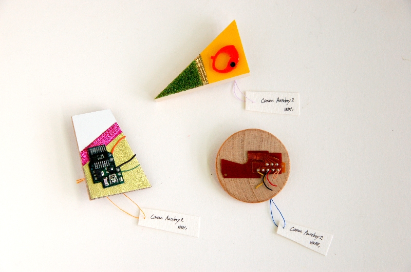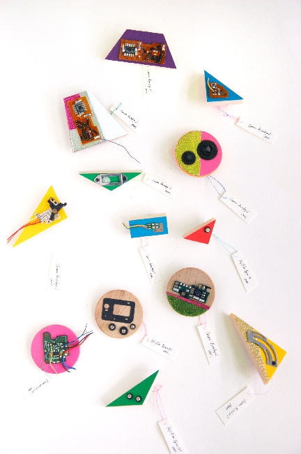 カメラを分解した部品を使って、バッジやオブジェを作りました。